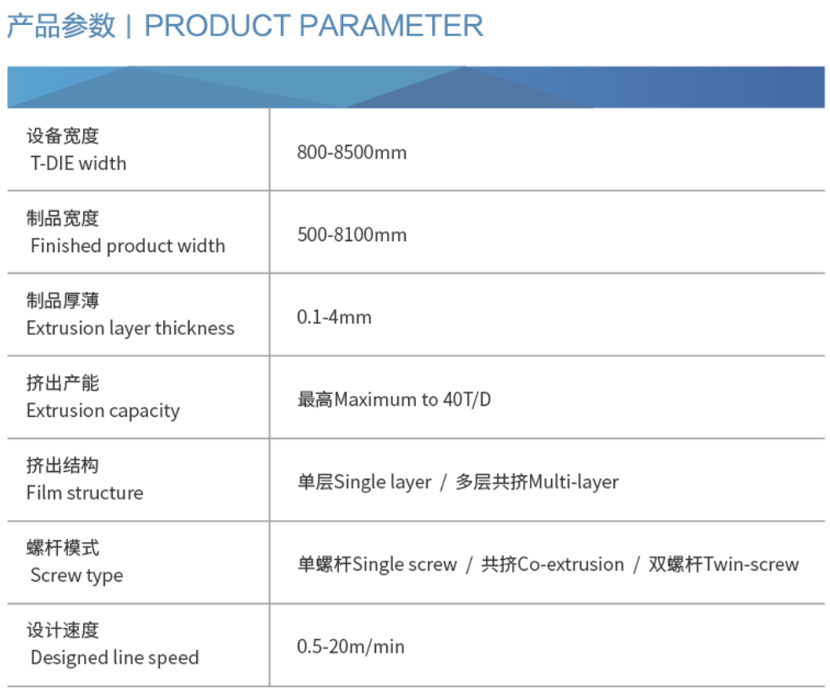 設(shè)備按制品結(jié)構(gòu)所需可選擇單層/多層共擠等工藝,還可裝備還可裝備原料自動(dòng)計(jì)量配料系統(tǒng),多工位自動(dòng)收卷系統(tǒng)、瑕疵檢測(cè)、在線測(cè)厚、全自動(dòng)調(diào)節(jié)模具、在線分切、卸卷稱重、遠(yuǎn)程維保系統(tǒng)等功能件。